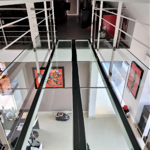 Nos clients nous ont contacté car ils souhaitaient installer un plancher de verre au premier étage de leur villa. La villa possède plusieurs grandes baies vitrées et ses propriétaires souhaitaient accentuer ce côté vitré. Ils nous ont donc contacté pour la réalisation d'un plancher de verre. Idéalement situé, ce plancher de verre leur permet de voir directement leur salon et leur piscine depuis le bord de leur chambre. Ce plancher de verre a permis d'augmenter la luminosité des pièces concernées et donne encore plus de cachet à la villa ! Vous souhaitez mettre en place un plancher de verre dans votre logement ? Que ce soit pour gagner en luminosité ou uniquement pour l'aspect esthétique, contactez nous au 02.49.88.35.59 ou directement en cliquant ici .